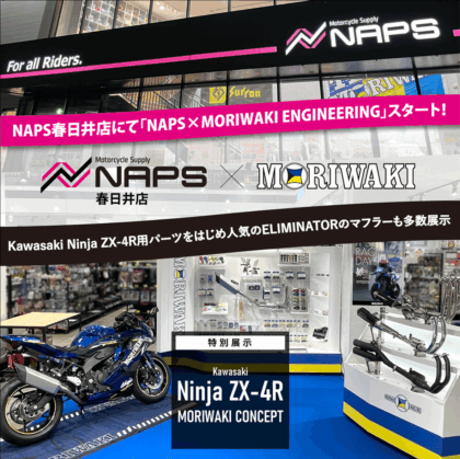 イベント情報 2025年9月26日より愛知県春日井市、NAPS春日井店にてNAPS×MORIWAKI ENGINEERINGスタートいたしました。Kawasaki Ninja ZX-4R MORIWAKI CONCEPT…